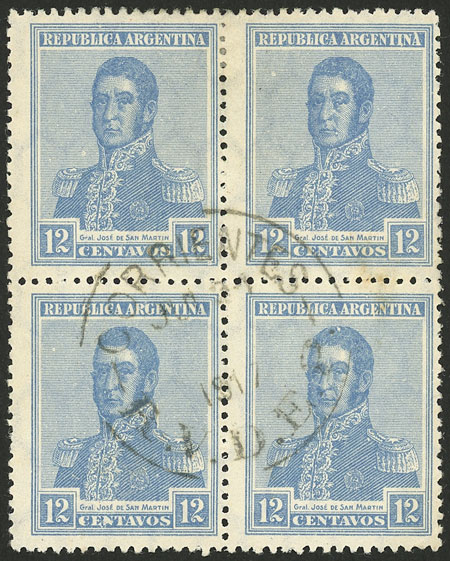 1917 12c. San Martín with VERTICAL honeycomb wmk, fantastic used block of 4, very fine quality, extremely rare, only 2 or 3 known! (Image)