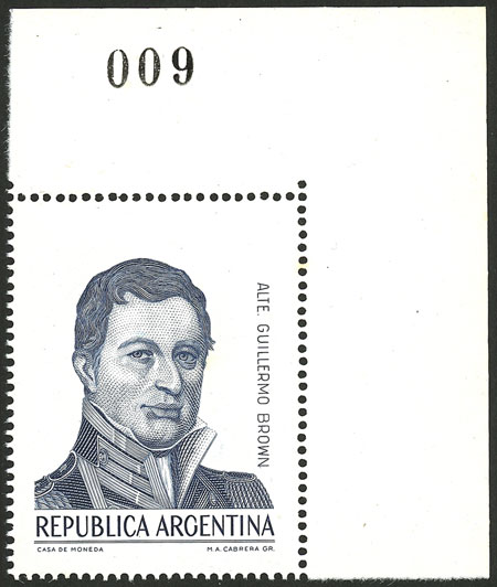 1983 Guillermo Brown, FACE VALUE OMITTED variety, MNH, sheet corner, excellent quality, rare, only a sheet of 50 is known! (Image)