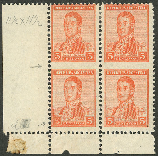 1921 5c. San Martín FORGERY to defraud the postal authorities, perf 11½, corner block of 4 IMPERFORATE between horizontally, excellent quality, very rare! (Image)
