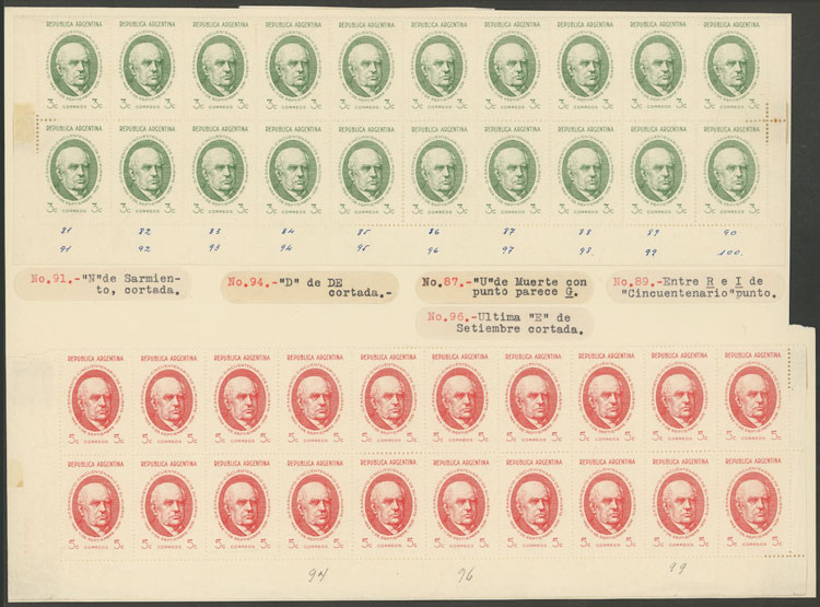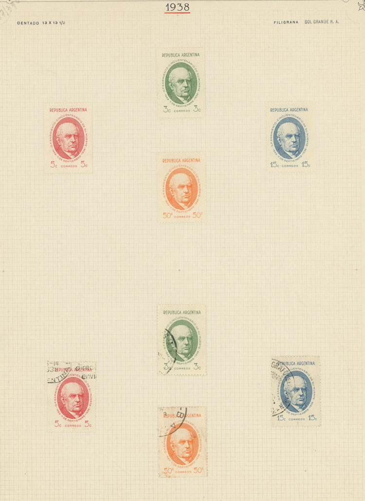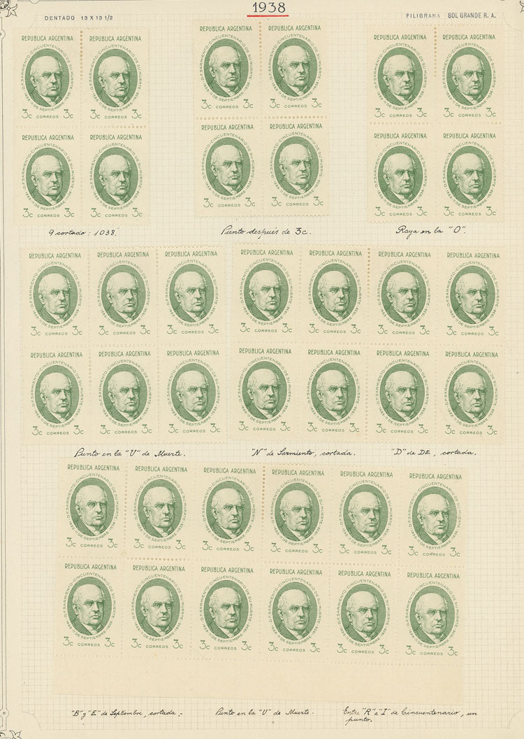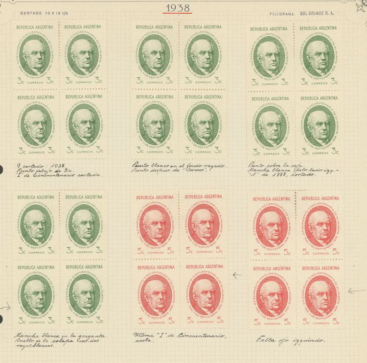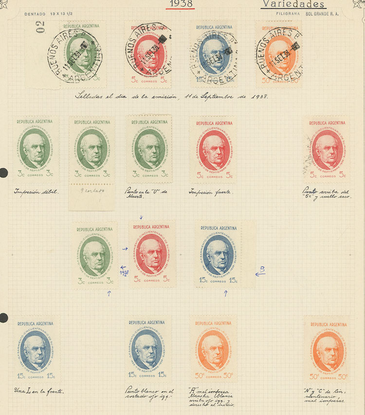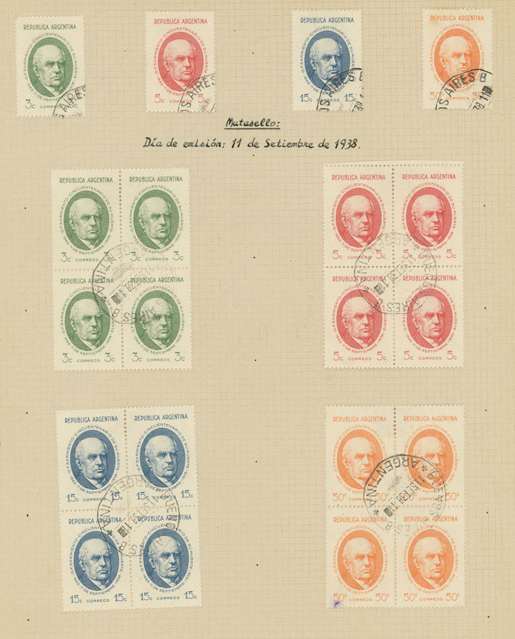 GJ.818/821, 1938 Sarmiento, STUDY OF THE ISSUE on 7 pages of an old collection, including the set mint and used (singles and in blocks of 4 in both cases) and MANY VARIETIES, all very neatly organized and of excellent quality! IMPORTANT:
