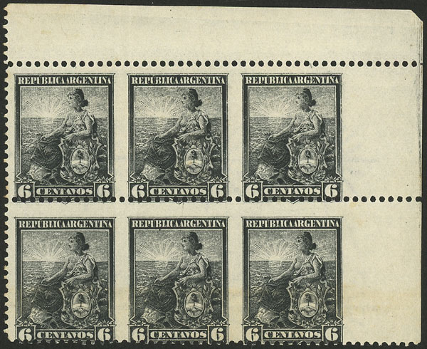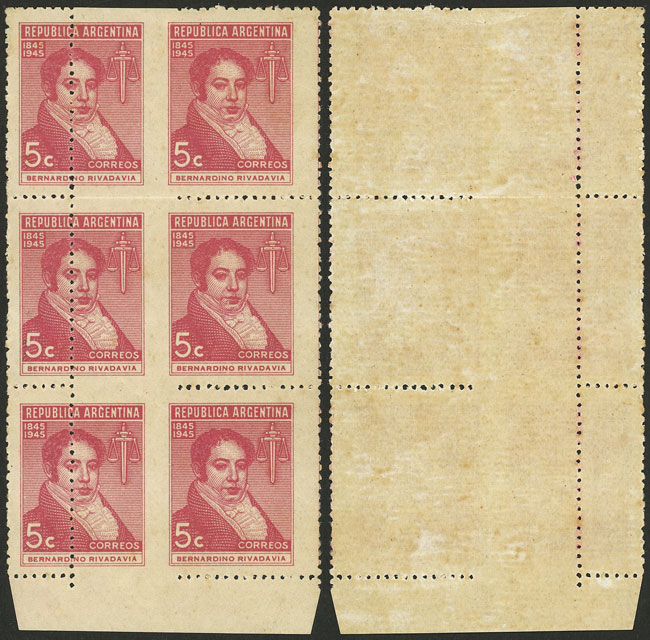 1945 5c. Rivadavia, block of 6 with perforation variety, WITHOUT CENTRAL PERFORATION, very attractive! (Image)