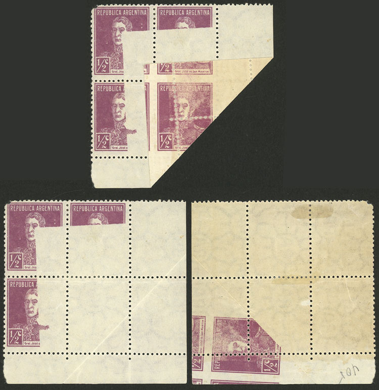 PRINTED ON GUM: GJ.594, 1924 ½c. San Martín in block of 4, the corner folded over before printing and one stamp and part of other stamps are unprinted on front, and PRINTED on back ON GUM, excellent and very rare! (Image)