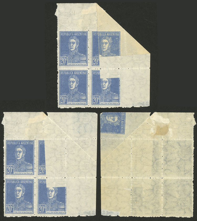 1924 20c. San Martín in block of 4, the corner folded over before printing and one stamp and part of another one is unprinted on front, and PRINTED on back ON GUM, excellent and very rare! (Image)