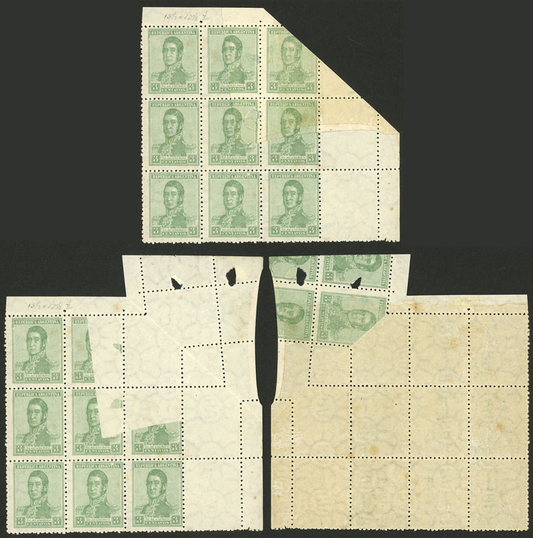 PRINTED ON GUM: GJ.546, 1922 3c. San Martín, large block of 9 stamps + labels, sheet corner with notable variety: the corner folded over before printing, and one stamp and part of other stamps is unprinted, and PRINTED on back ON GUM, very fine