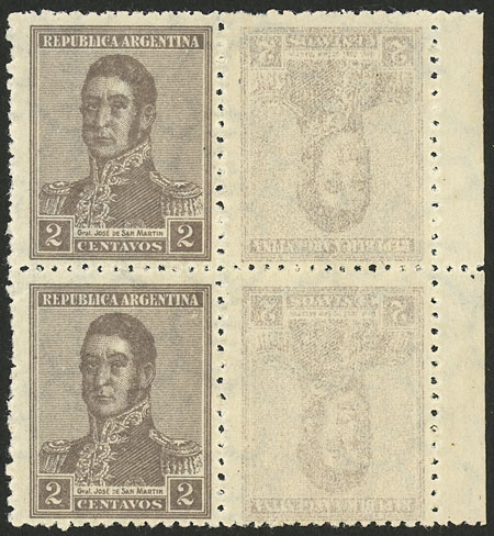 TETE-BECHE: GJ.545CD, 1922 2c. San Martín, vertical pair with right labels, the latter have a (faint) inverted impression forming tete-beches, very fine quality, rare!
