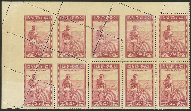 25c. Plowman without watermark, large corner block of 10 with notable irregular perforation variety produced by a foldover, excellent! (Image)