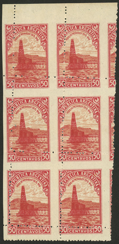50c. Petroleum well at sea, block of 6 with the PERFORATION VERY SHIFTED and diagonal, and imperforate at top, excellent! (Image)