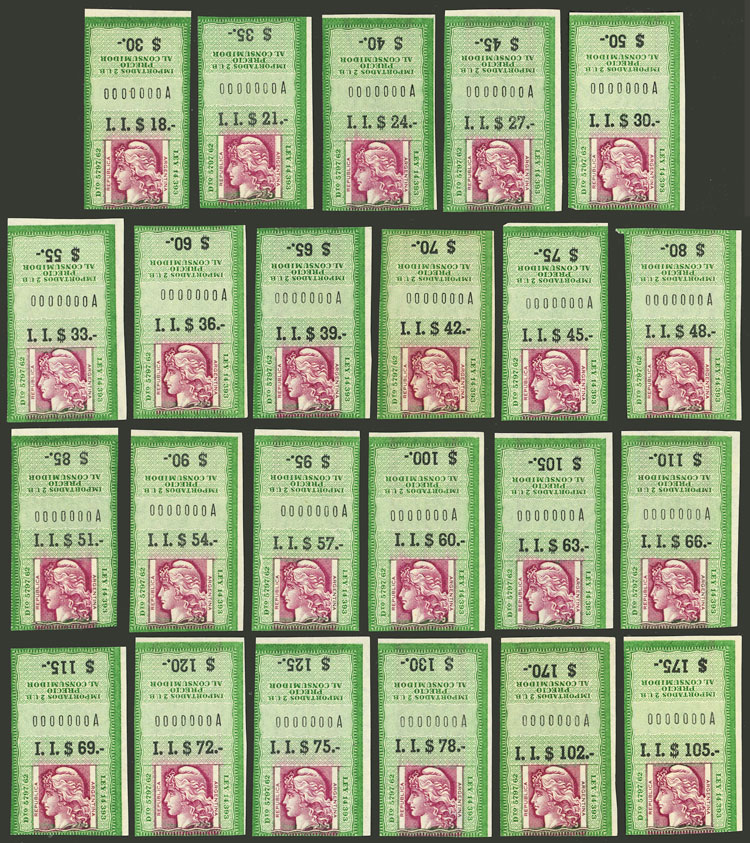241   imageImported cigarettes (statute 14,393), set of 23 revenue stamps for sale to the public between $30 and $175 with numbering 0 (specimens), excellent quality, very rare! (Image)