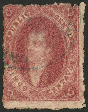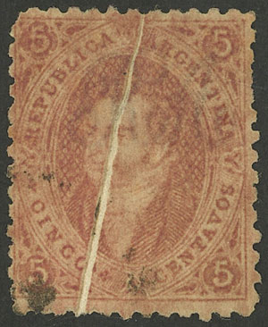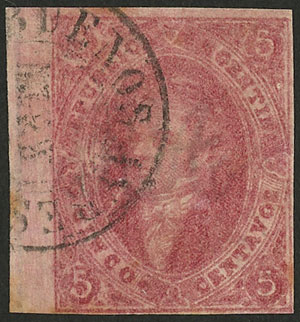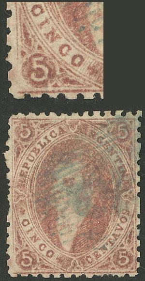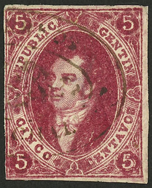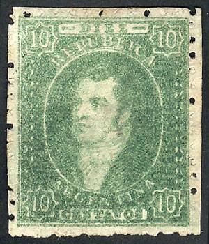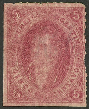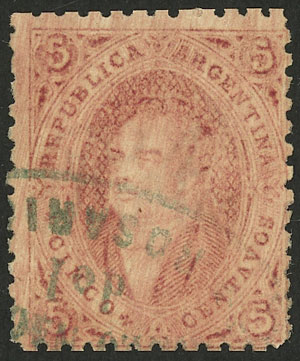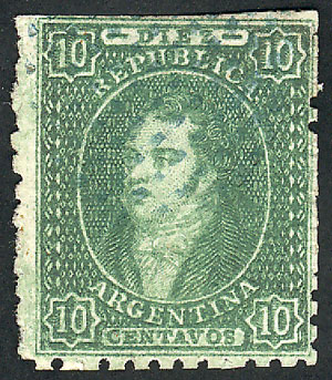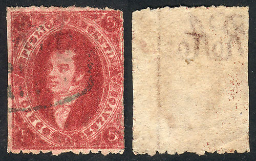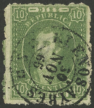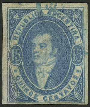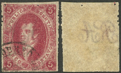 15c. worn impression, IMPERFORATE (it missed the perforating machine), used in Rosario, with 4 complete margins (3 are very wide!), very fine quality! NOTE: These stamps that are NOT from 1st printing clear impression, but that are imperforate, are