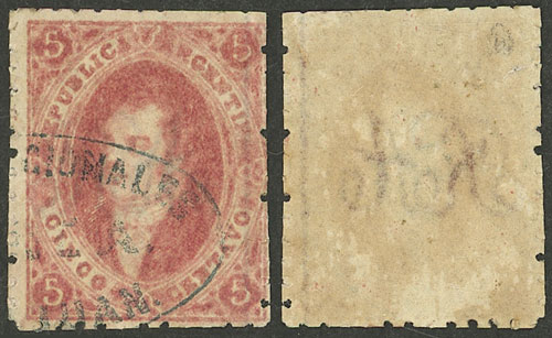 3rd printing, with mulatto and dirty plate (horizontally) varities, also line watermark at top, used in Rosario, excellent! (Image)