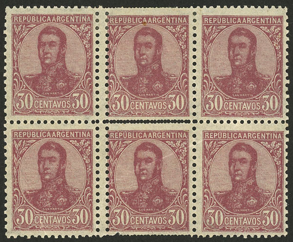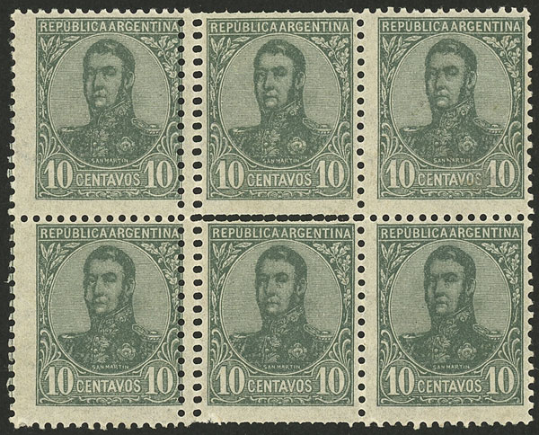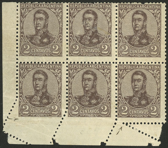 1908 2c. San Martín in oval, corner block of 6 with notable variety: IRREGULAR PERFORATION produced by a pre-perforating foldover, excellent! (Image)