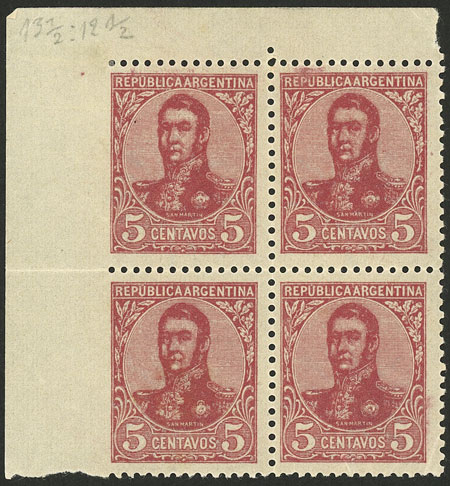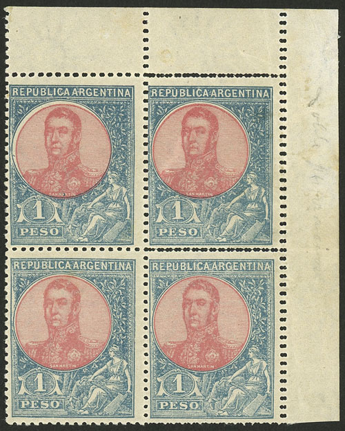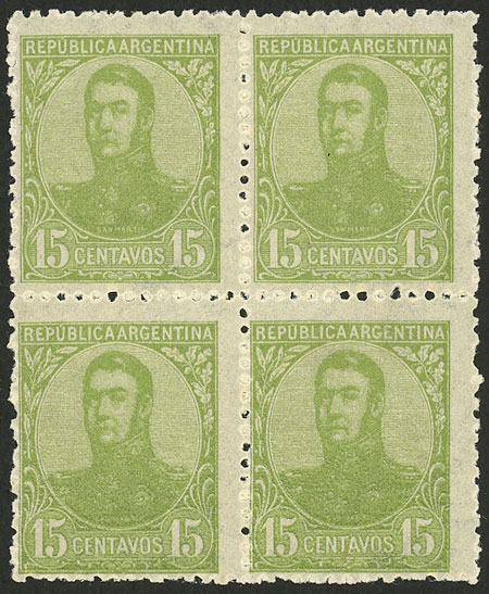 1908 15c. San Martín in oval, block of 4, the lower stamps WITHOUT "SAN MARTÍN" INSCRIPTION, excellent! (Image)