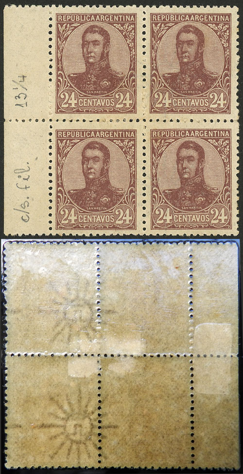 BLOCK OF 4: GJ.297b, 24c. San Martín in oval, PERFORATION 13½, block of 4 with and without watermark, VF, few known! (Image)