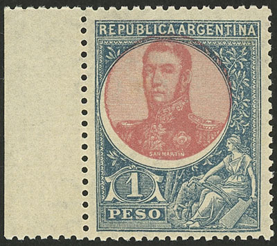 1P. San Martín in oval with notable variety: CENTER SHIFTED upwards, VF! (Catalog value of a normal example: US$36) (Image)