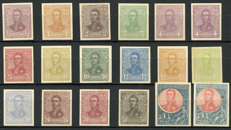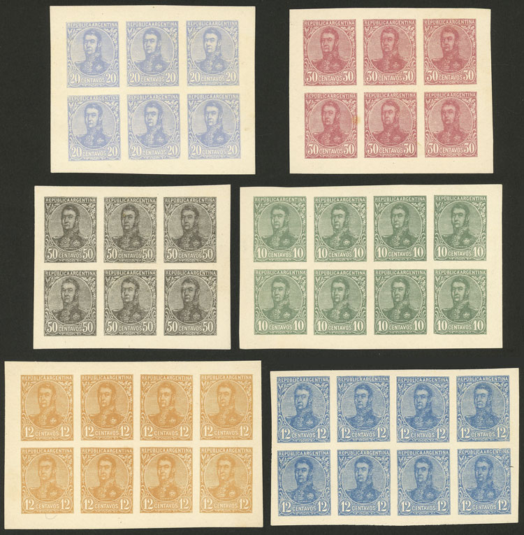 other values, 1908 San Martin in oval, PROOFS in the original colors, typographed and printed in sheets of 8 for the values of 10c., 12c. (blue and orange), and sheets of 6 for 20c., 30c. and 50c., in total 6 sheets, excellent quality, rare! (Image)
