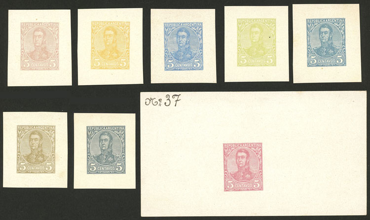 5c. San Martín in oval, 8 DIE PROOFS in different colors including the adopted one: larger, with number "37", very fine quality, rare lot! (Image)