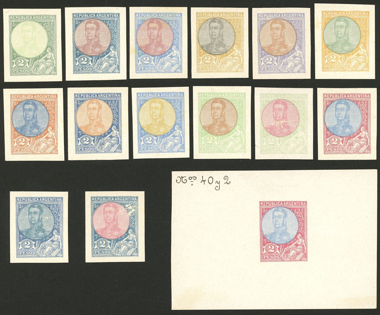 Martín in oval, 15 DIE PROOFS in different colors of an unissued value of 2P., one larger and with number "40 y 2", in general of very fine quality (a couple with small defects), rare lot! (Image)