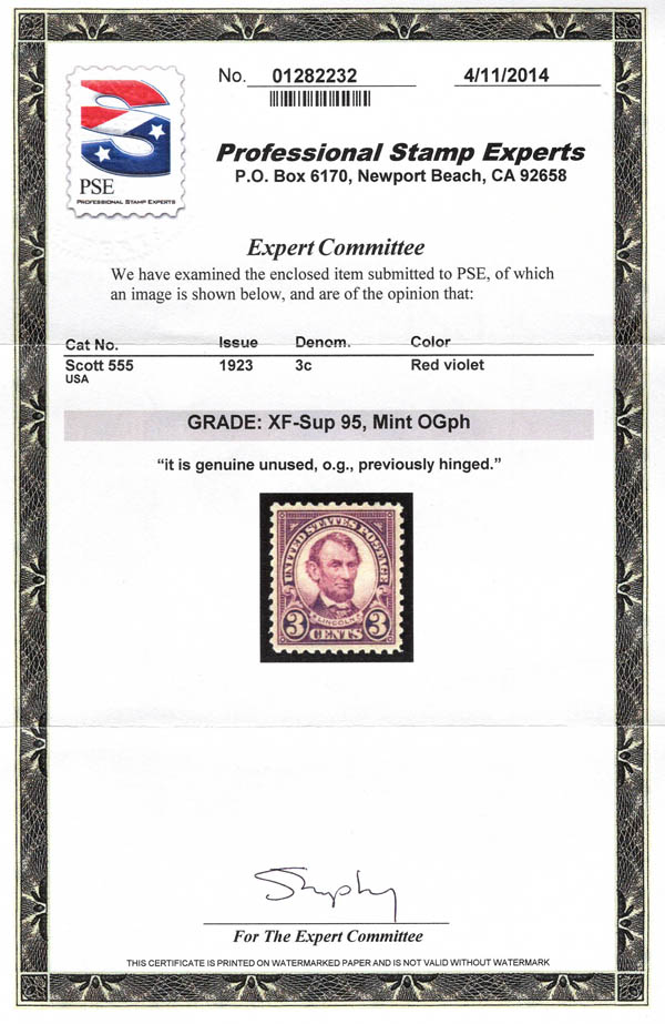 1923, 3¢ Lincoln (Scott 555), near perfect centering, o.g., invisibly hinged, Extremely Fine to Superb, with 2014 P.S.E. certificate graded XF-SUP 95. Scott $13. SMQ