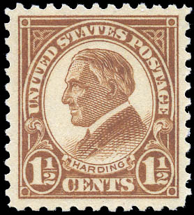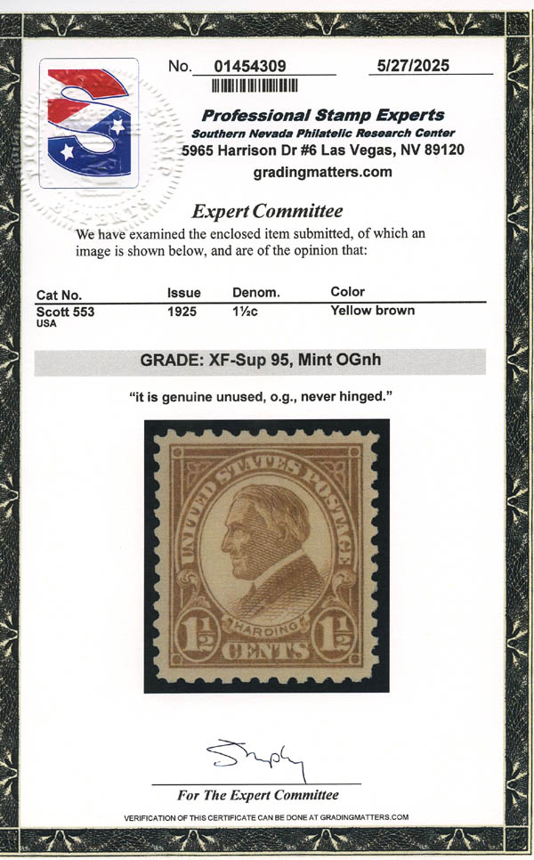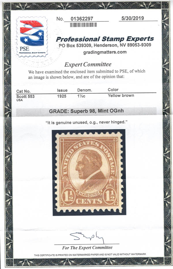 1925, 1½¢ Harding (Scott 553), o.g., never hinged, Extremely Fine to Superb, with 2025 P.S.E. certificate graded XF-SUP 95. SMQ $115. Estimate $80 - 120. (Image) (Image2)