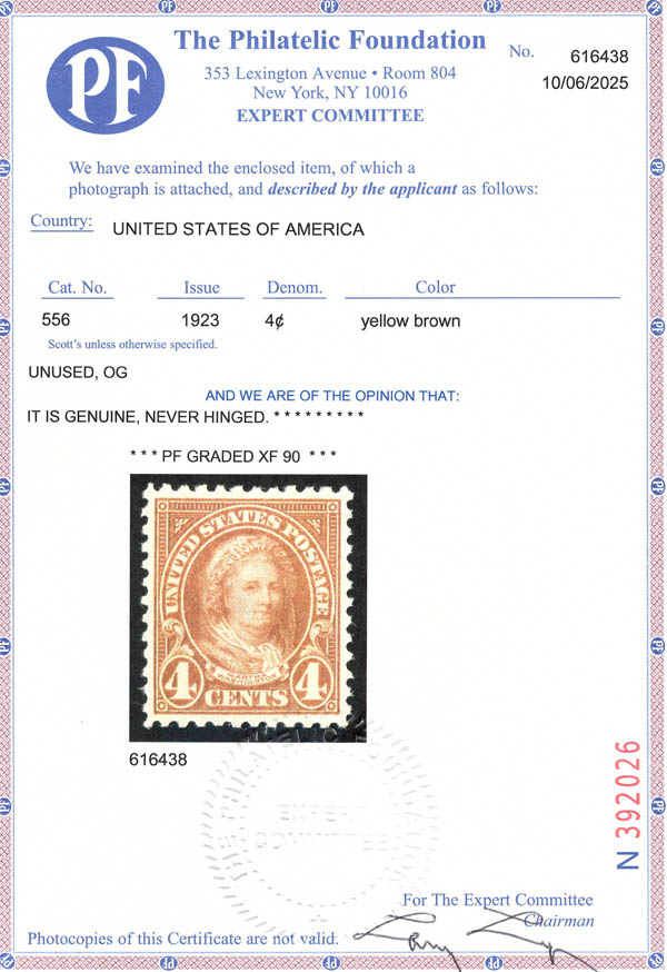 1923, 4¢ Martha Washington (Scott 556), o.g., never hinged, Extremely Fine, with 2025 P.F. certificate graded XF 90. Scott $35. SMQ $115. Estimate $80 - 120. (Image) (Image2)