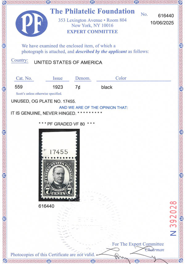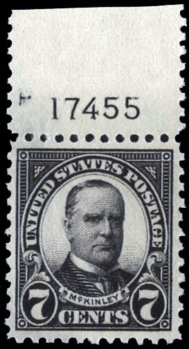 1923, 7¢ McKinley (Scott 559), plate number single, o.g., never hinged, Very Fine, with 2025 P.F. certificate graded VF 80. Scott $16. SMQ $35. Estimate $25 -