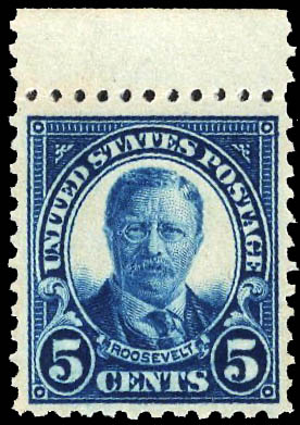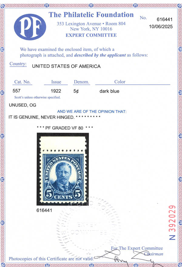 1922, 5¢ Roosevelt (Scott 557), sheet margin single, o.g., never hinged, Very Fine, with 2025 P.F. certificate graded VF 80. Scott $35. Estimate $30 - 40. (Image) (Image2)