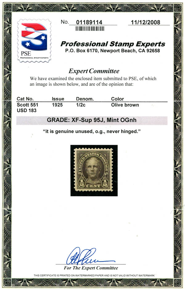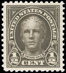 1925, ½¢ Nathan Hale (Scott 551), near perfect centering amid large margins, o.g., never hinged, Extremely Fine to Superb, with 2008 P.S.E. certificate graded XF-SUP