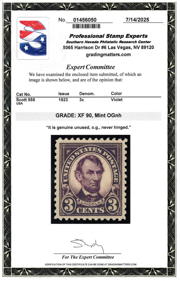 1923, 3¢ Lincoln (Scott 555), o.g., never hinged, Extremely Fine, with 2025 P.S.E. certificate graded XF 90. Scott $28. SMQ $100. Estimate $75 - 100. (Image) (Image2)