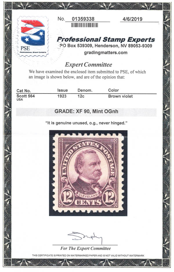 1923, 12¢ Grover Cleveland (Scott 564), o.g., never hinged, Extremely Fine, with 2019 P.S.E. certificate graded XF 90. SMQ $50. Estimate $35 - 50. (Image) (Image2)