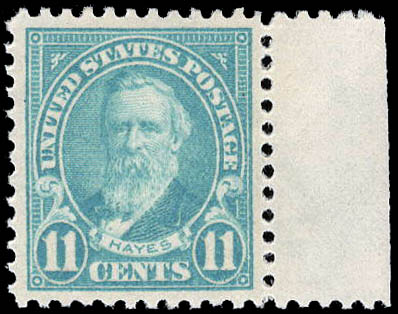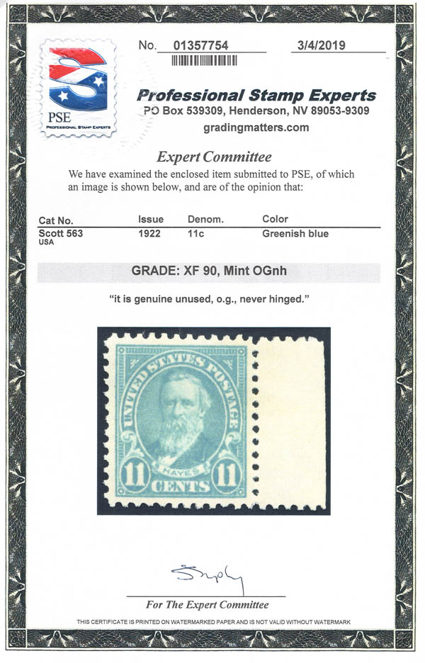 1922, 11¢ Hayes (Scott 563), sheet margin single, o.g., never hinged, Extremely Fine, with 2019 P.S.E. certificate graded XF 90. SMQ $55. Estimate $40 - 60. (Image) (Image2)