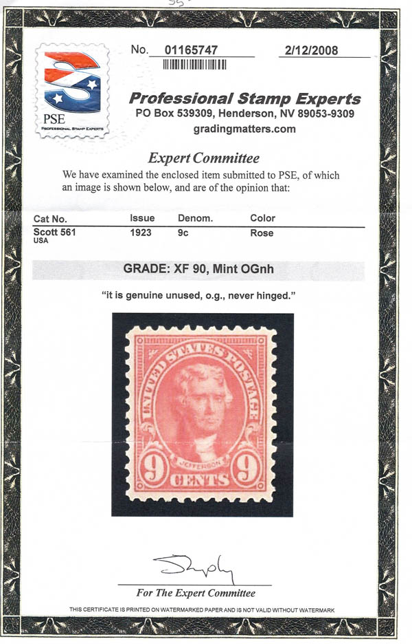 1923, 9¢ Jefferson (Scott 561), o.g., never hinged, Extremely Fine, with 2008 P.S.E. certificate graded XF 90. Scott $25. SMQ $100. Estimate $75 - 100. (Image) (Image2)