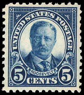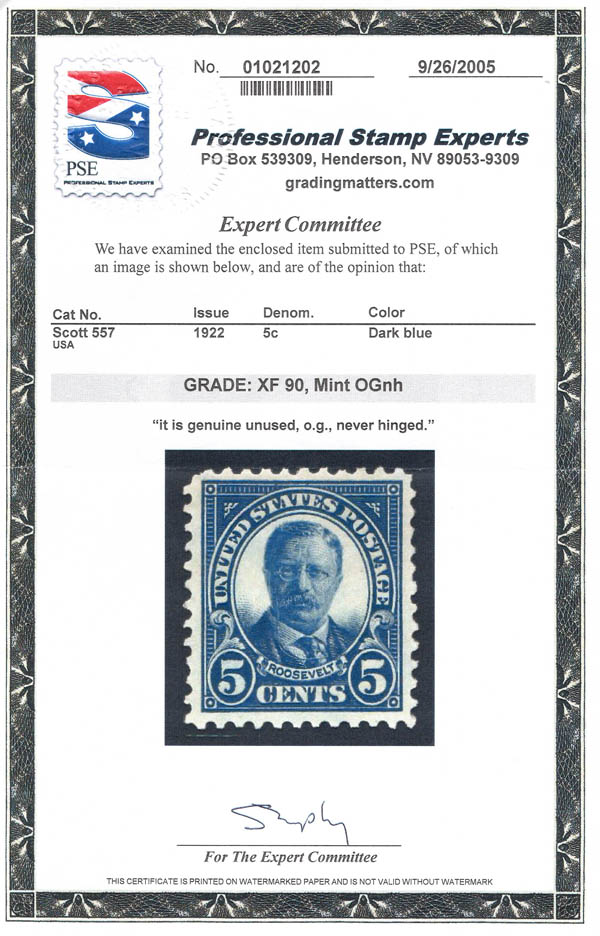 1922, 5¢ Roosevelt (Scott 557), o.g., never hinged, Extremely Fine, with 2005 P.S.E. certificate graded XF 90. Scott $35. SMQ $95. Estimate $75 - 100. (Image) (Image2)