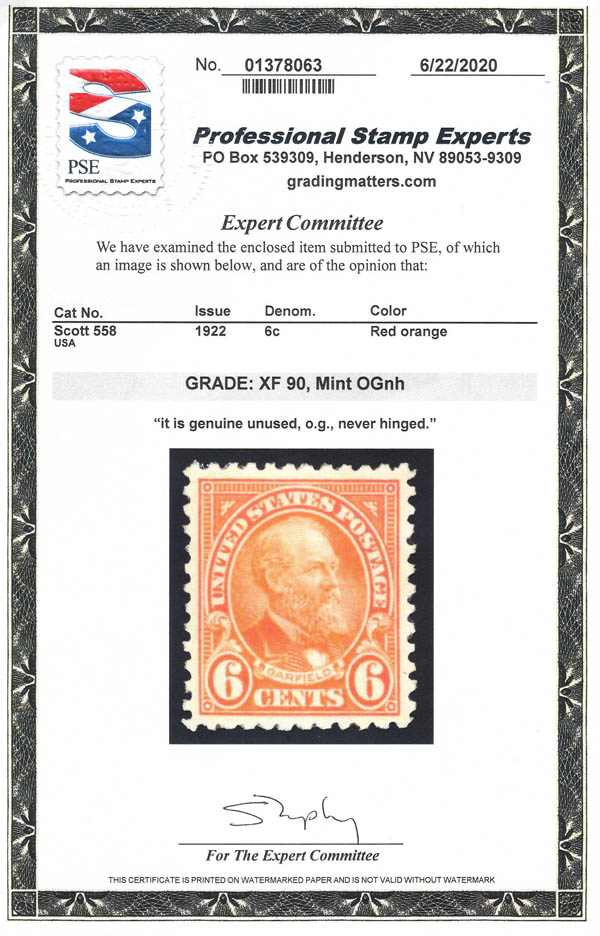 1922, 6¢ Garfield (Scott 558), radiant color, o.g., never hinged, Extremely Fine, with 2020 P.S.E. certificate graded XF 90. SMQ $110. Estimate $75 - 100. (Image) (Image2)