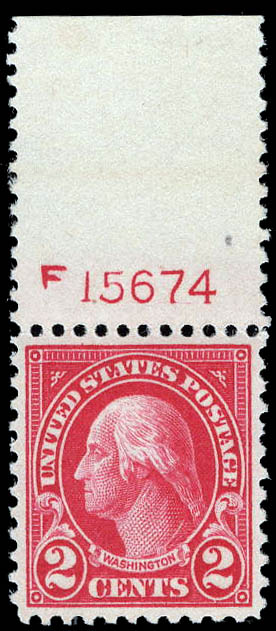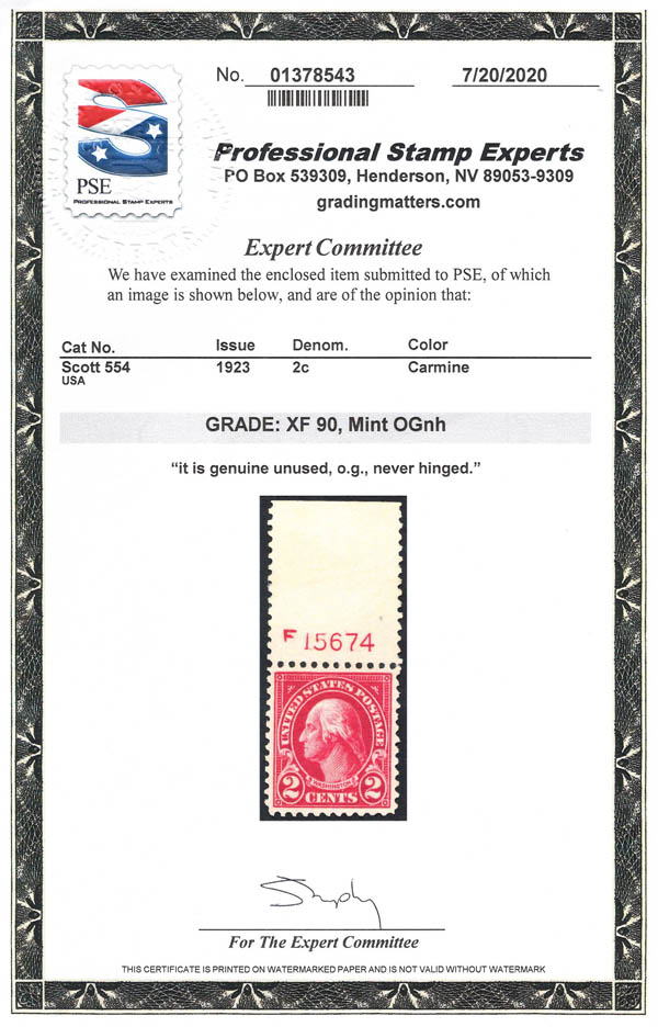 1923, 2¢ Washington (Scott 554), plate number single, o.g., never hinged, Extremely Fine, with 2020 P.S.E. certificate graded XF 90. SMQ $75. Estimate $50 - 75. (Image) (Image2)