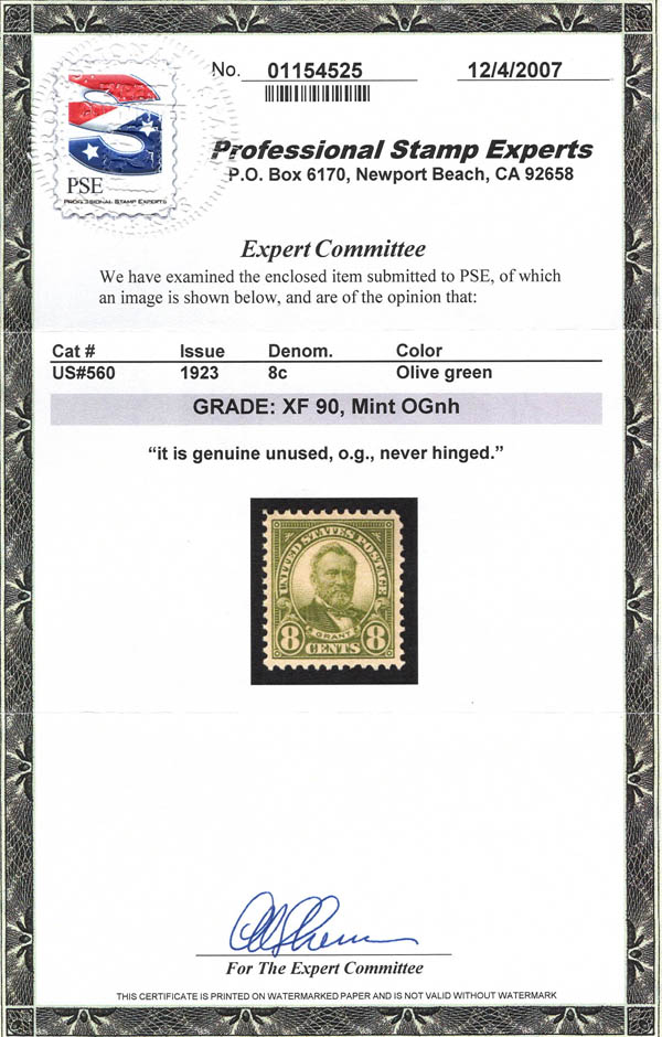 1923, 8¢ Grant (Scott 560), near perfect centering and rich color, o.g., never hinged, Extremely Fine, with 2007 P.S.E. certificate graded XF 90. Scott $80. SMQ