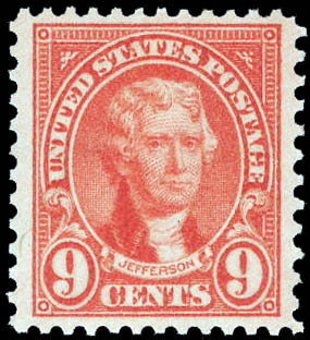 1923, 9¢ Jefferson (Scott 561), o.g., never hinged, Very Fine to Extremely Fine. Scott $25. Estimate $30 - 40. (Image)
