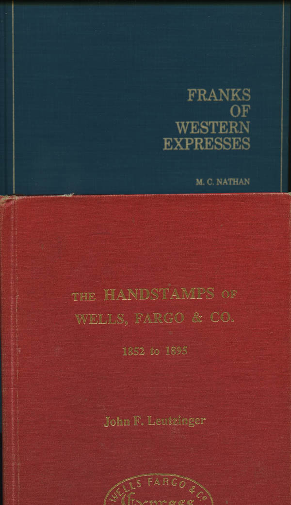 437   imageNathan, M. C., Franks of Western Expresses, published in 1973, hard bound, 281 pages, extensively illustrated in black & white; like new. Also The Handstamps of Wells, Fargo & CO., 1852 to 1895, by John F. Leutzinger, published 1993, 2nd edition, 371 pages, illustrated in black & white; a bit worn with occasional notes scribbled into the text. Shipping weight 4.25 lbs / 1.95 kilos.