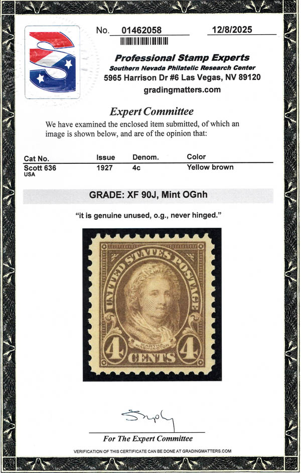 1927, 4¢ Martha Washington, rotary press printing (Scott 636), o.g., never hinged, Extremely Fine, with 2025 P.S.E. certificate graded XF 90J. SMQ $60. Estimate