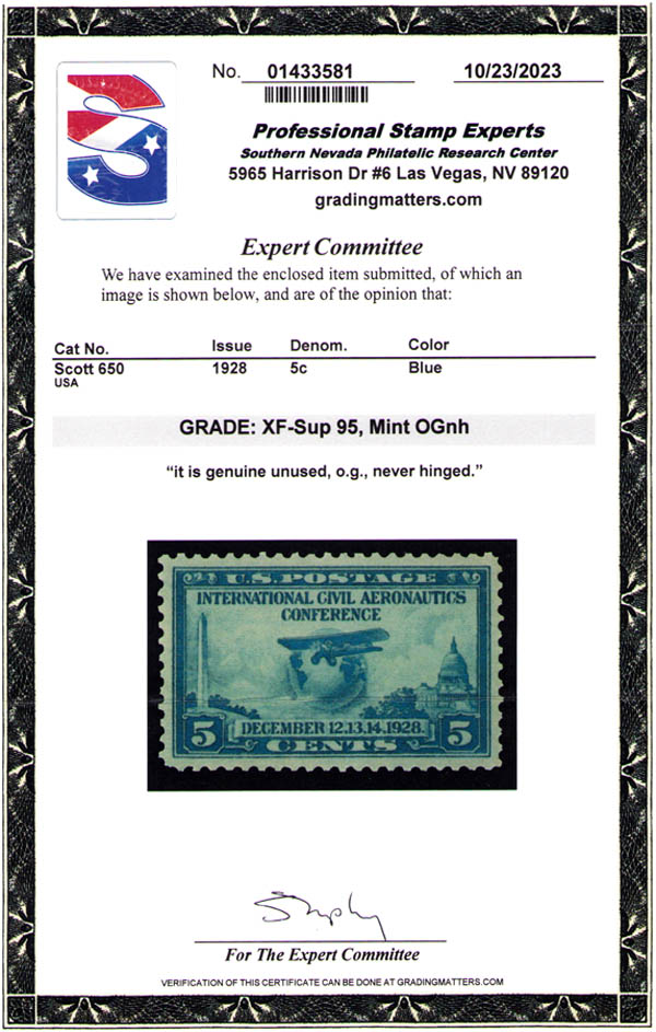1928, 5¢ Civil Aeronautics (Scott 650), o.g., never hinged, Extremely Fine to Superb, with 2023 P.S.E. certificate graded XF-SUP 95. SMQ $45. Estimate $35 - 50. (Image) (Image2)