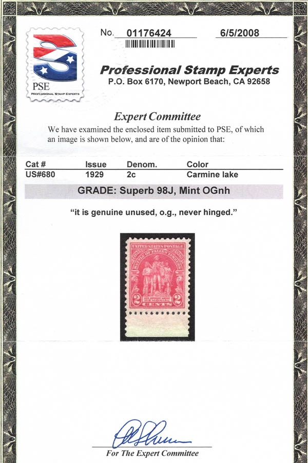1928, 2¢ Valley Forge (Scott 645), o.g., never hinged, Extremely Fine to Superb, with 2010 P.S.E. certificate graded XF-SUP 95J. SMQ $140. Estimate $100 - 150. (Image) (Image2)