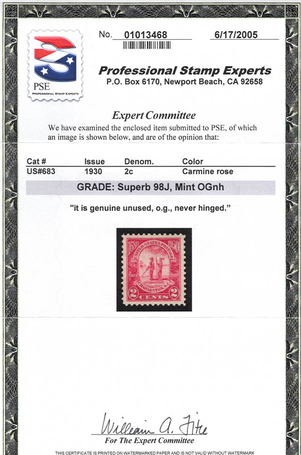 1930, 2¢ Charleston (Scott 683), magnificent margins and essentially perfect centering, o.g., never hinged, Superb, with 2005 P.S.E. certificate graded SUP 98J. SMQ