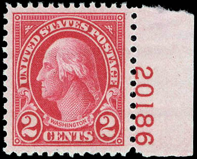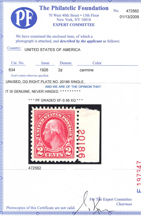 1926, 2¢ Washington, type I, rotary press printing (Scott 634), plate number single, o.g., never hinged, Extremely Fine to Superb, with 2009 P.F. and 2026 P.S.A.G. certificates, both graded XF-SUP 95. SMQ $80. Estimate $60 - 80. (Image) (Image2)