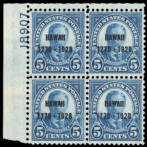 1928, 5¢ Hawaii (Scott 648), plate block of 4, o.g., never hinged, Very Fine. Scott $375. Estimate $180 - 240. (Image)