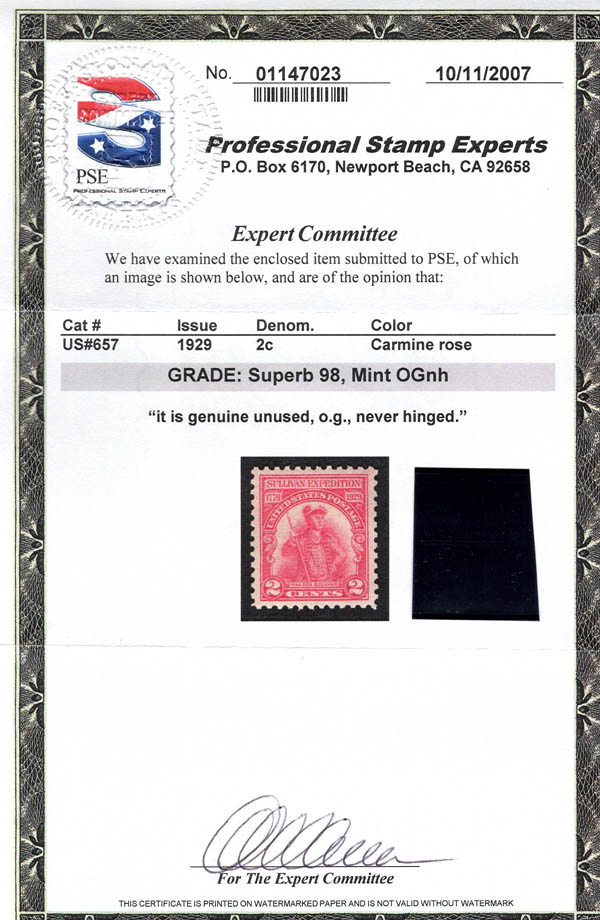 1929, 2¢ Sullivan Expedition (Scott 657), o.g., never hinged, Superb, with 2007 P.S.E. certificate graded SUP 98. SMQ $190. Estimate $120 - 180. (Image) (Image2)