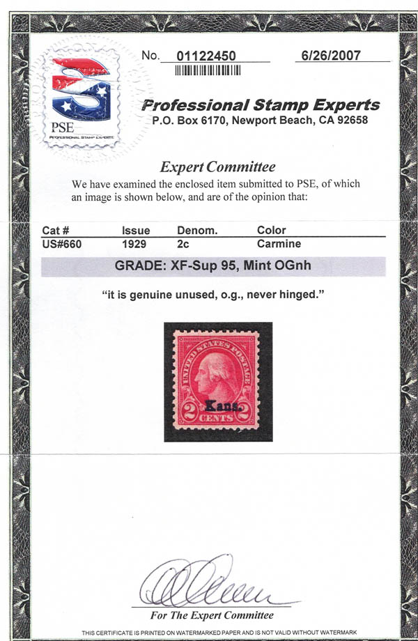 1929, 2¢ Kans. (Scott 660), o.g., never hinged, Extremely Fine to Superb, with 2007 P.S.E. certificate graded XF-SUP 95. SMQ $190. Estimate $120 - 180. (Image) (Image2)