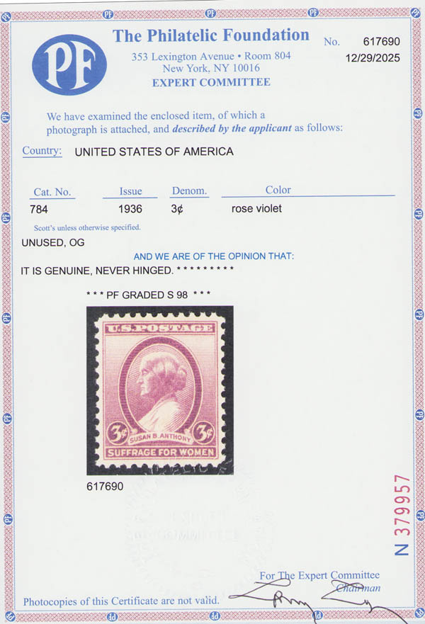 1936, 3¢ Susan B. Anthony (Scott 784), o.g., never hinged, Superb, with 2025 P.F. certificate graded SUP 98. SMQ $125. Estimate $80 - 120. (Image) (Image2)