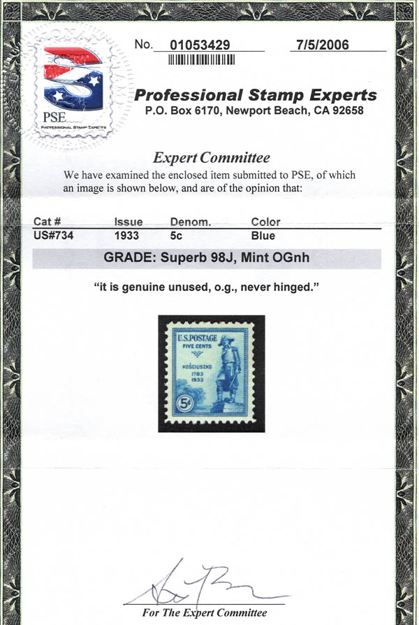 1933, 5¢ Kosciuszko (Scott 734), o.g., never hinged, Superb, with 2006 P.S.E. certificate graded SUP 98J. SMQ $265. Estimate $180 - 240. (Image) (Image2)