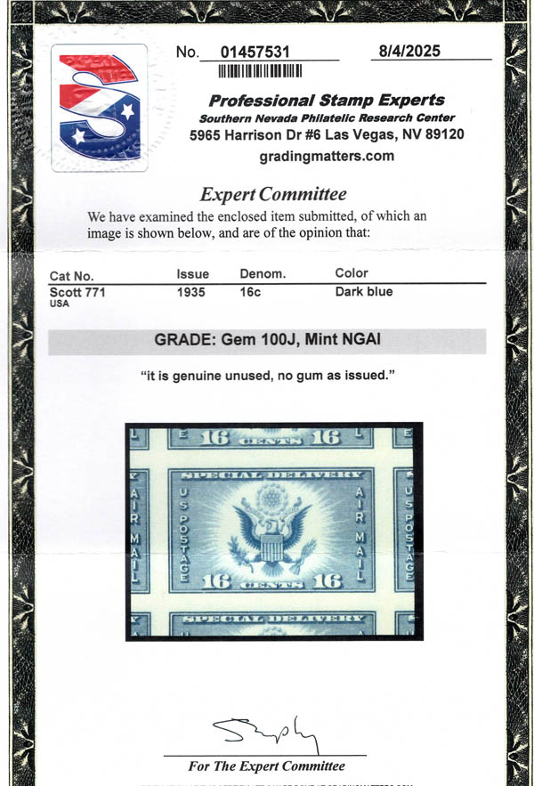 1935, 16¢ Airmail Special Delivery, imperf. (Scott 771), without gum as issued, Superb, with 2025 P.S.E. certificate graded GEM 100J. SMQ $65. Estimate $40 -