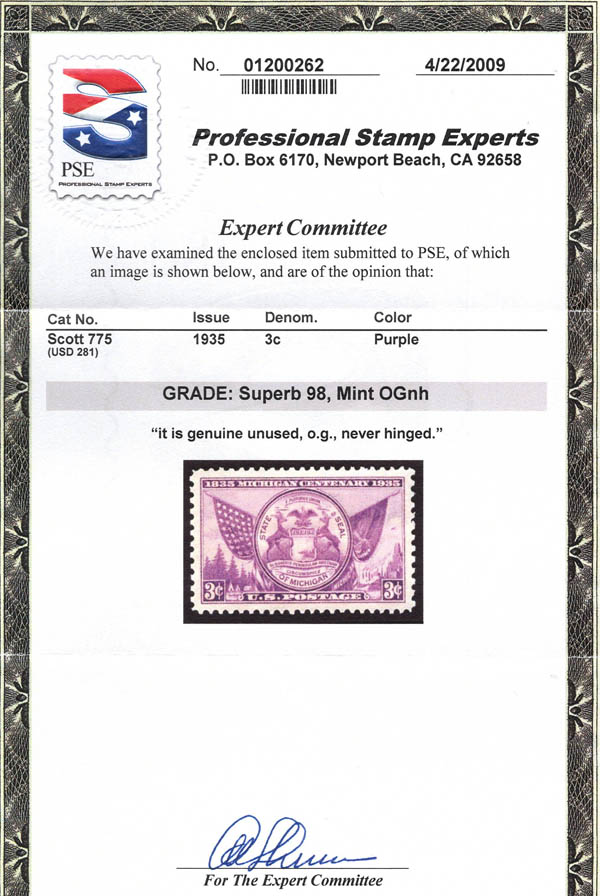 1935, 3¢ Michigan Centenary (Scott 775), o.g., never hinged, Superb, with 2009 P.S.E. certificate graded SUP 98. SMQ $75. Estimate $50 - 75. (Image) (Image2)