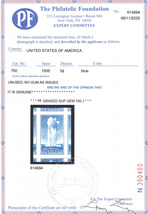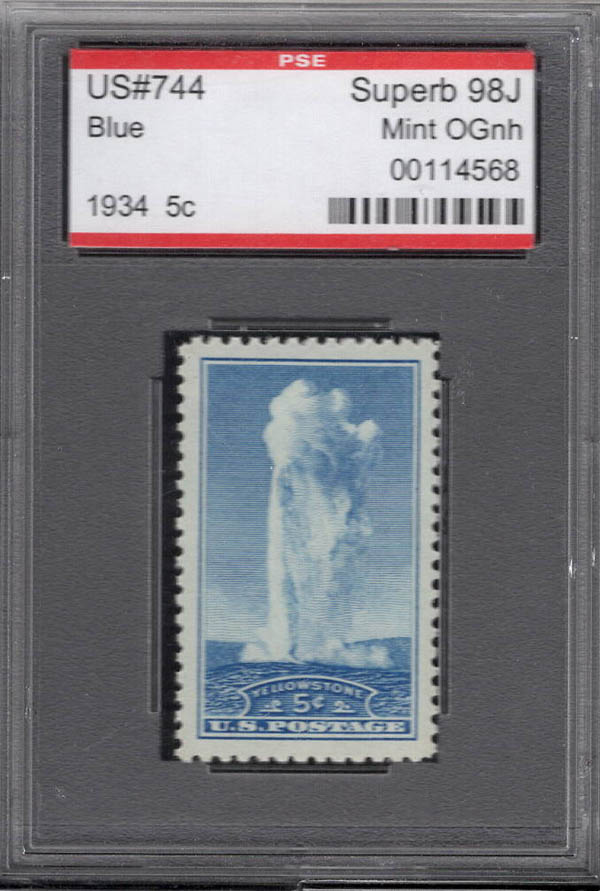 1934, 5¢ Yellowstone National Park, perforated (Scott 744), o.g., never hinged, Superb, with P.S.E. encapsulated certificate graded SUP 98J. SMQ $85. Estimate $60
